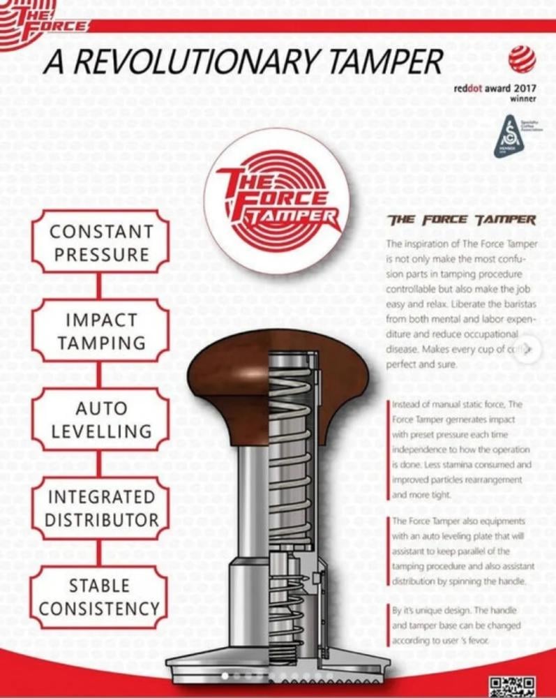 فورس تامبر الحاصل على جائزة red dot كأفضل تصميم ضمن الكبس بمقدار ثابت في كل مرة لتجنب شدة الضغط المتفاوتة مقارنة بالضغط اليدي التقليدي قابل للتعديل للتحكم بشدة الكبس اللفة الواحدة تعادل 0،5 كيلوجراممزود بقاعدة من السيليكون بشعار الشركة